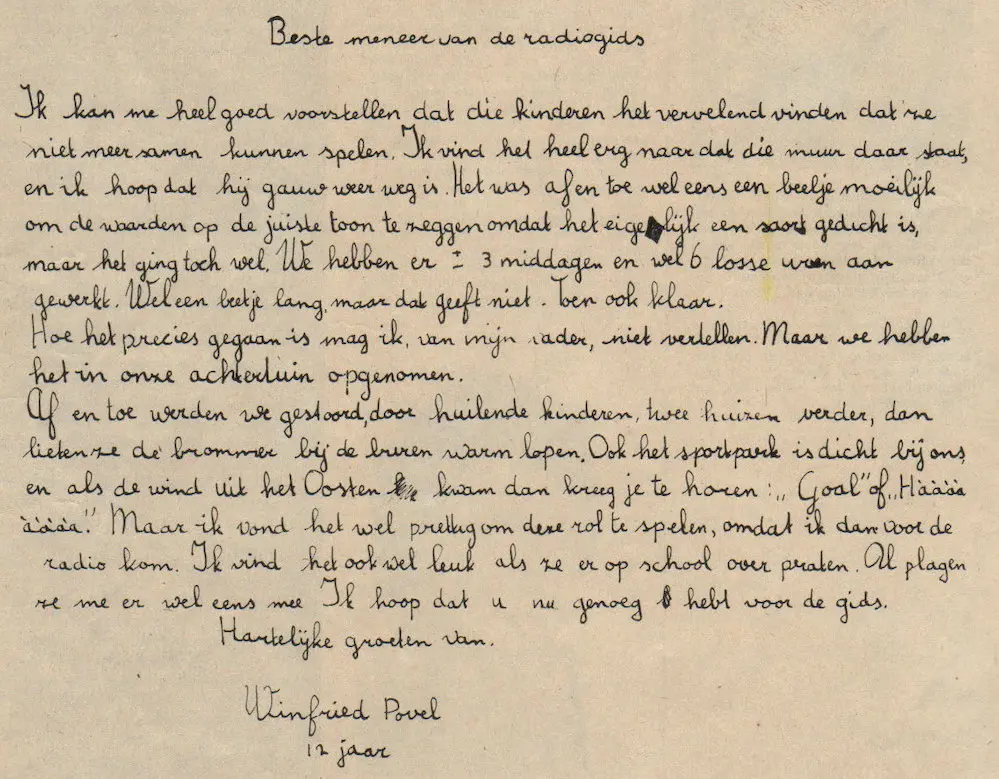 Het hoorspel is de monoloog van een een kind en wordt uitgevoerd door Winfried Povel, de twaalfjarige zoon van de regisseur. In dit experiment zijn heel wat uren van repetitie en opnamen gaan zitten, maar Léon Povel gelooft, dat de opname die zondagavond de ether in gaat aan de te stellen eisen voldoet.